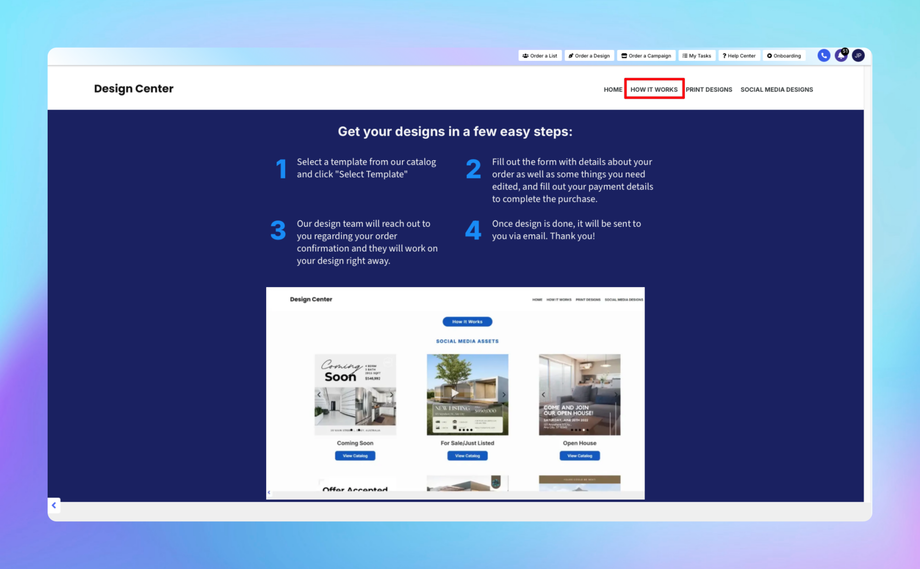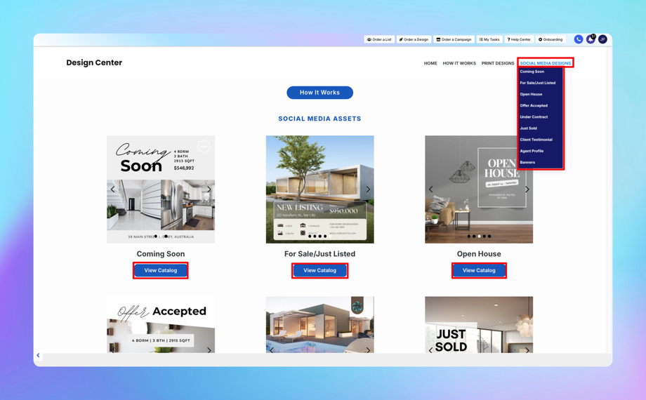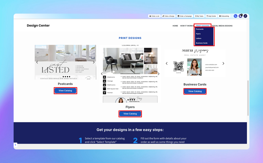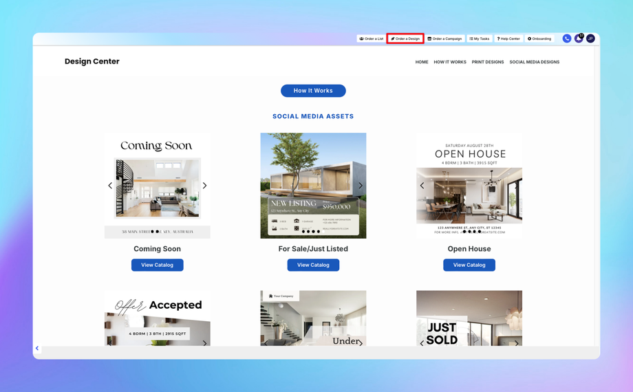 The Design Center is your all-in-one platform, providing professional and customizable marketing designs tailored specifically for real estate professionals and businesses. Whether you’re aiming to create eye-catching print materials for direct mail campaigns or need captivating visuals for your digital platforms, the Design Center offers a comprehensive range of resources to elevate your marketing efforts.