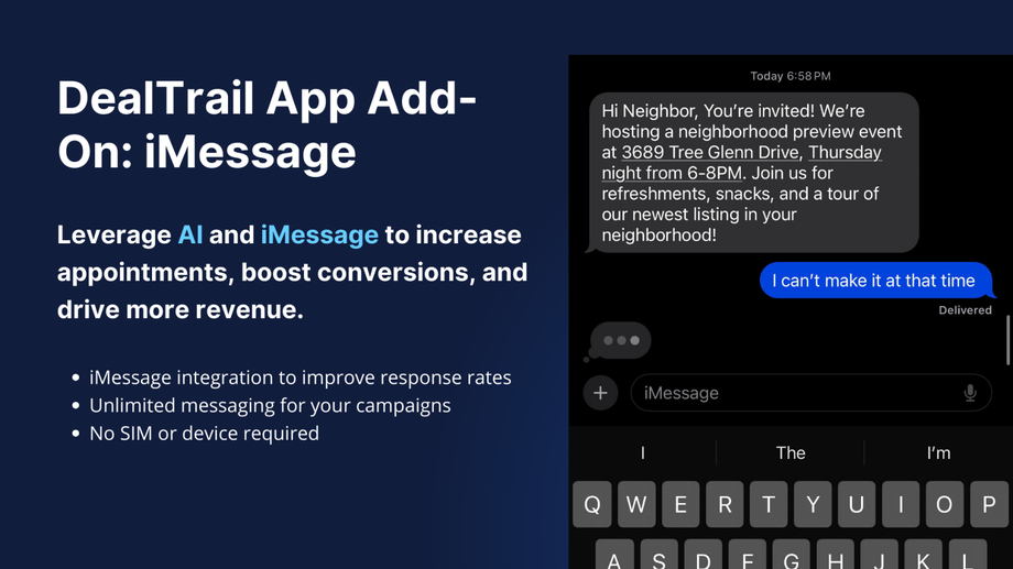 By integrating iMessage with DealTrail, you can deliver fast, efficient, and meaningful communications, ensuring you stay connected with your clients and leads in real time.
